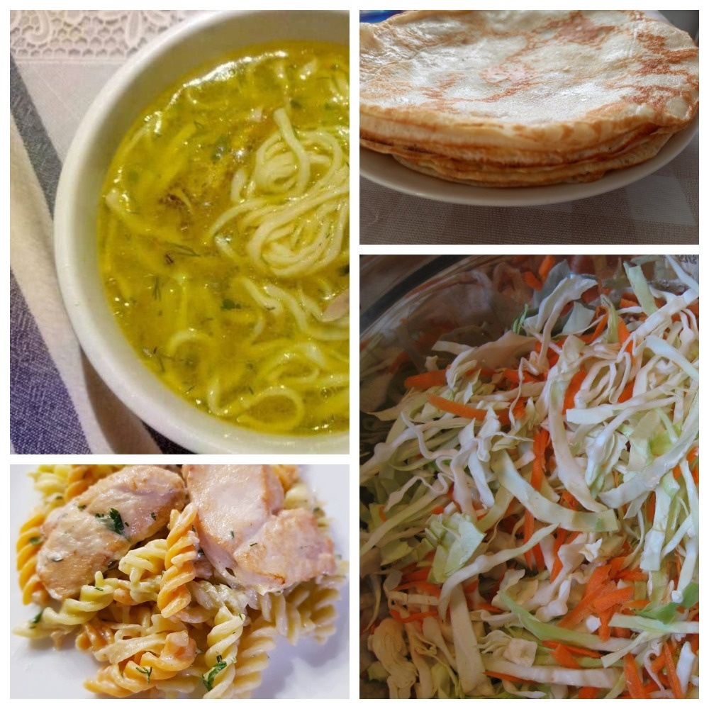 - Ужин: макароны с курицей и салат из капусты.