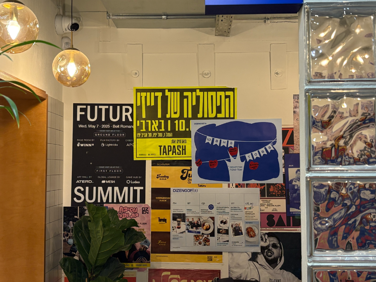 Интерьер нового Dizengof/99 радужен и уютен: теплые оттенки дерева, светлые стенки и зелёные акценты создают ощущение комфорта. Стены украшены постерами в стиле израильских произведений искусства, а одно из пространств выделено оригинальными фотографиями. Освещение способствует расслабленной атмосфере, где нет ничего лишнего, только уют и гармония.