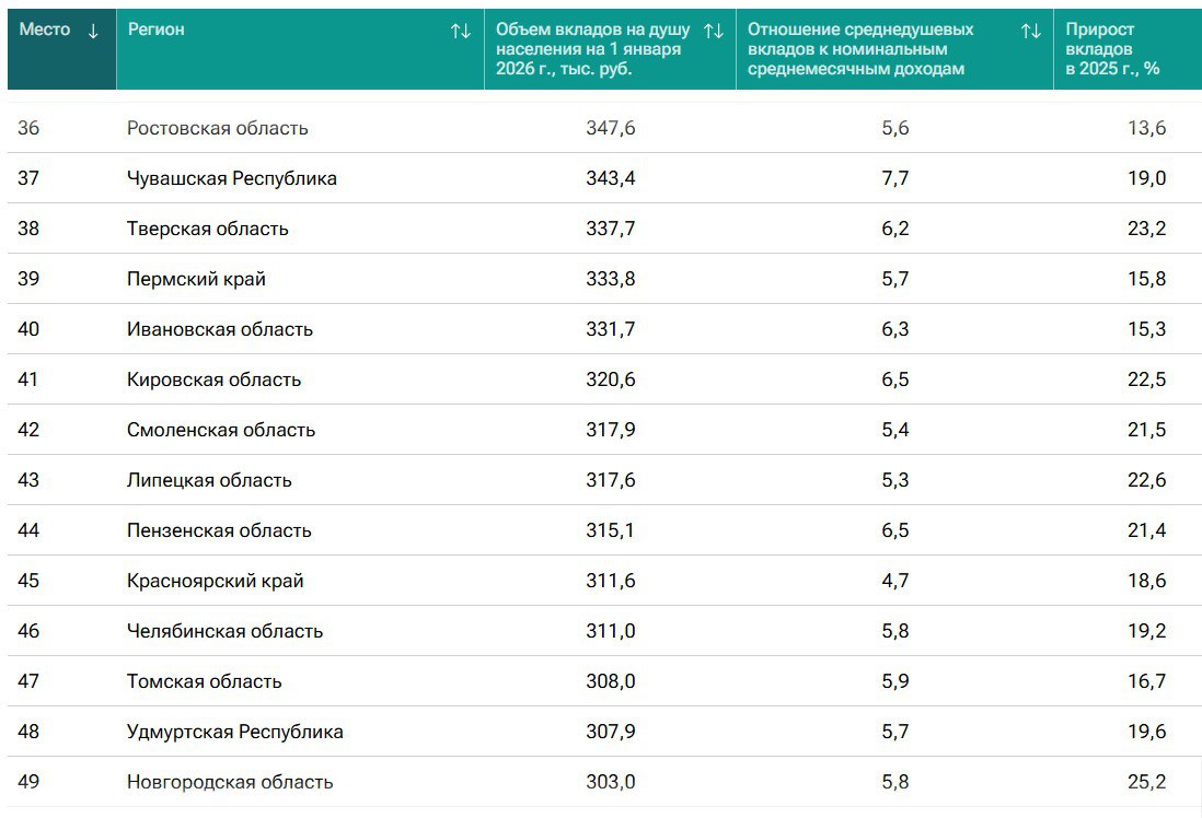 В десятку лучших по накоплениям, кроме столиц, вошли в основном северные регионы: Магаданская, Мурманская области, Камчатский край, Сахалинская область, Чукотский автономный округ, ХМАО и ЯНАО. В этих семи регионах (с 4-го по 10-е места) вклады на душу населения составляют от 702 до 504 тыс. рублей.