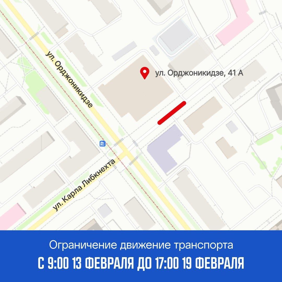 - с 9.00 13 февраля до 17.00 19 февраля по проезду Орджоникидзе для проведения работ по локализации аварийного дефекта теплосети