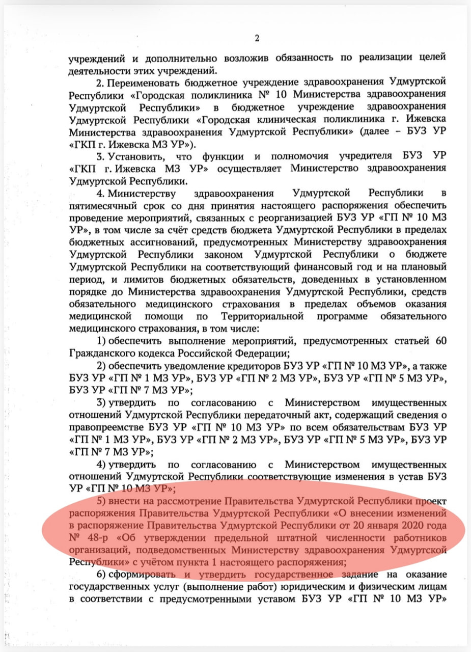 Медицинский профсоюз «Действие» располагает документом правительства Удмуртии, которое по каким-то причинам пока не опубликовано на официальном сайте правительства. Распоряжение было подписано премьер-министром республики Романом Ефимовым еще 27 января 2026 года.