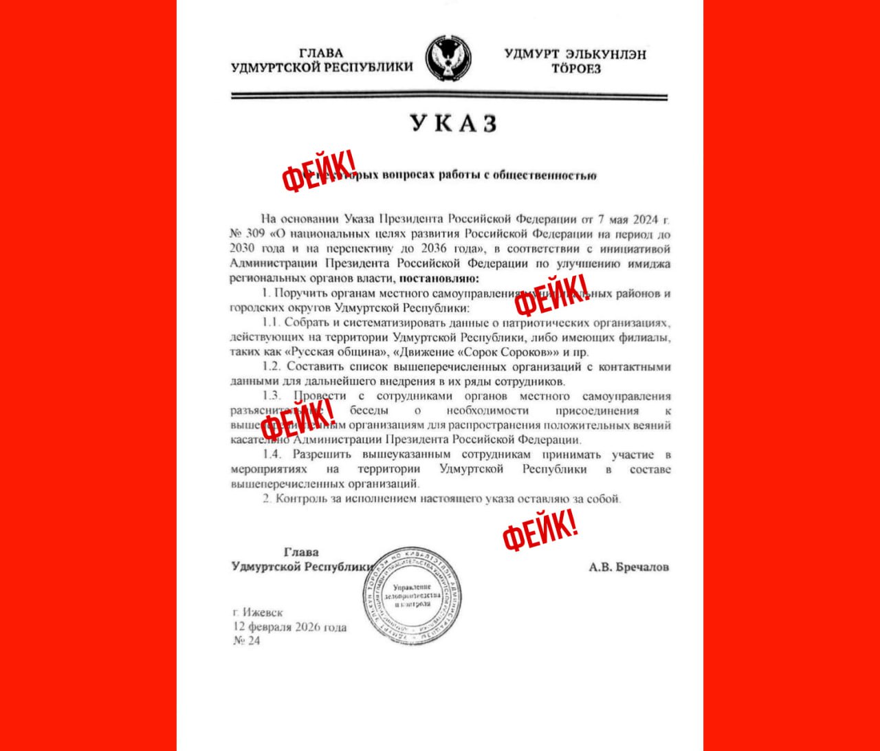 Представляем вашему вниманию, друзья, новый фейк — якобы подписанный главой Удмуртии «указ» «о некоторых вопросах работы с общественностью».