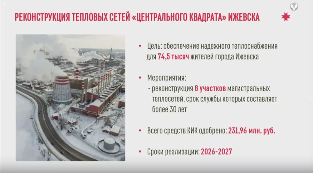 Еще один важный проект в Ижевске — реконструкция теплосетей в так называемом «центральном квадрате». Здесь обновляем 8 участков магистральных сетей, некоторым из них более 30 лет. Общая протяженность сетей, подлежащих перекладке — почти 2 км. Для 74 тыс. жителей центра города это означает, что отопительный сезон будет проходить без проблем. Кроме того, после такого ремонта можно будет переходить к глубокой модернизации наружного благоустройства самой красивой части нашего города. Срок реализации — 2026-2027 годы.