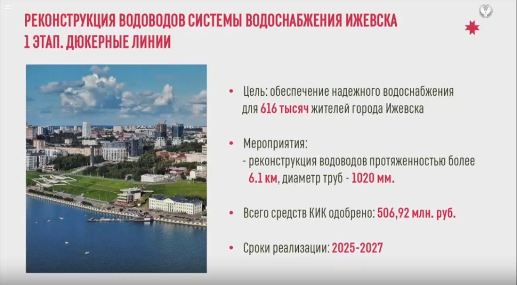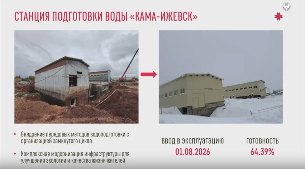 «Один из главных объектов этого года - станция подготовки воды «Кама-Ижевск». Ввод объекта планируем 1 августа 2026 года. Готовность объекта на сегодня — 64%.Далее — о завершении долгостроя. Мы практически заканчиваем строительство главной канализационной насосной станции № 3 и коллектора № 26. Их запуск повысит надежность всей системы водоотведения для растущих микрорайонов. Строительство планируется закончить 30 сентября 2027 года».