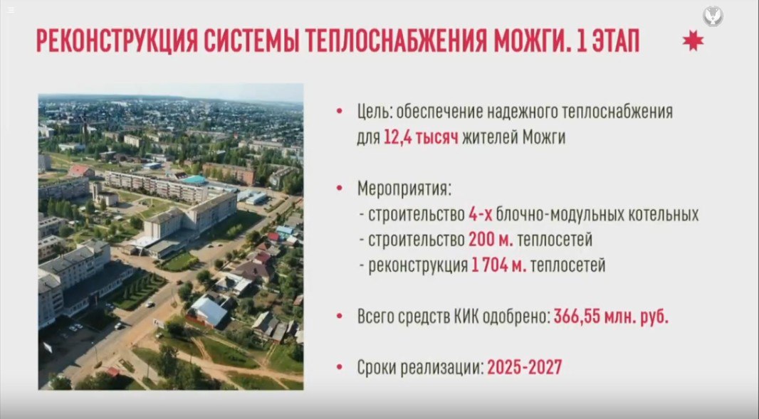 Можга. Наша цель — обеспечить надёжное теплоснабжение для 12,5 тыс. жителей города. Мы строим 4 современные модульные котельные, параллельно ведется строительство новых и реконструкция почти 2 км старых теплосетей. Сроки реализации – 2027 год.Ижевск. Реконструируем дюкерные линии — главные питьевые артерии города. Обновляем участок протяженностью более 6 км и диаметром метр. Сроки реализации — 2025-2027 годы.