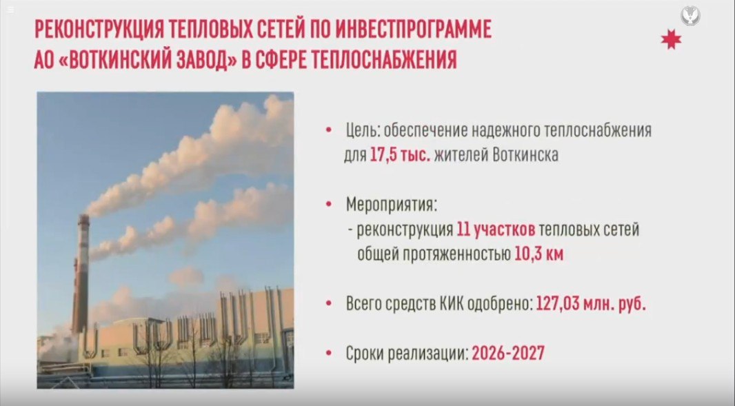 Воткинск. Работаем по инвестиционной программе градообразующего предприятия. Реконструируем 11 участков теплосетей. Общая протяженность — более 10 км. Главная цель — надежное теплоснабжение для 17,5 тыс. жителей и создание запаса прочности для подключения новых потребителей. Ну и, конечно же, надежное теплоснабжение главного предприятия города. Срок реализации — 2026-2027 годы.
