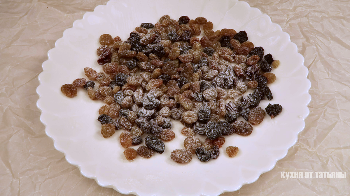 Для начала изюм рекомендуется залить кипятком на пять минут, а затем тщательно просушить с использованием бумажного полотенца. Смешайте его с небольшим количеством муки, чтобы устранить лишнюю влагу.