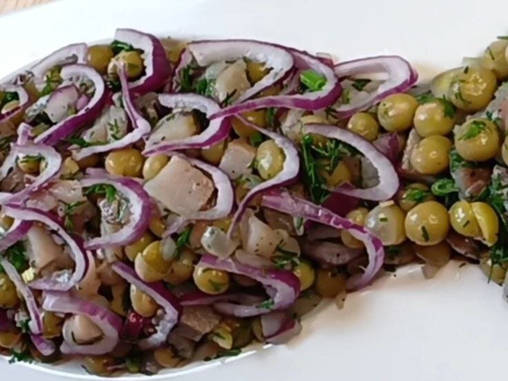 Первым шагом является нарезка филе сельди на средние кубики, которые помещаются в салатницу. Далее, добавляется консервированный зеленый горошек.