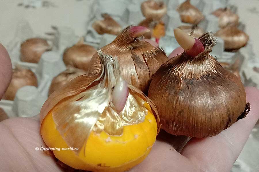 3. К моменту посадки отсортируйте луковицы на группы по времени цветения. Аккуратно удалите чешуйчатую оболочку, чтобы не повредить молодой росток, который начинает формироваться.