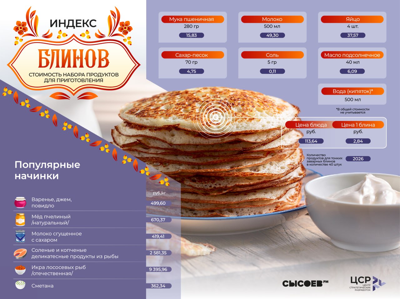 Среднюю стоимость набора продуктов для выпечки блинов в России, опираясь на данные Росстата, рассчитал Центр стратегических разработок. В среднем эта сумма составила 113,64 рубля, это на 4,7% меньше по сравнению с 2025 годом.