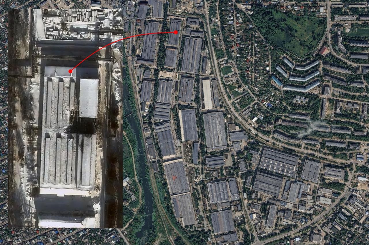 Судя по спутниковому снимку, опубликованному противником, прилетевший боеприпас проломил крышу, создав большое отверстие размером 30 на 24 метра и нанеся обширные повреждения, что нехарактерно для обычных дальнобойных дронов с небольшой боевой частью.