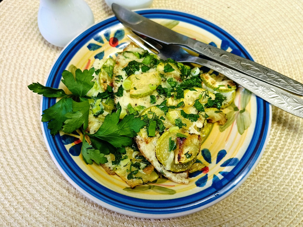 Как только кабачки будут готовы, залейте их взбитым яйцом, посыпьте нарезанной зеленью и жарьте ещё пару минут до полной готовности яиц.