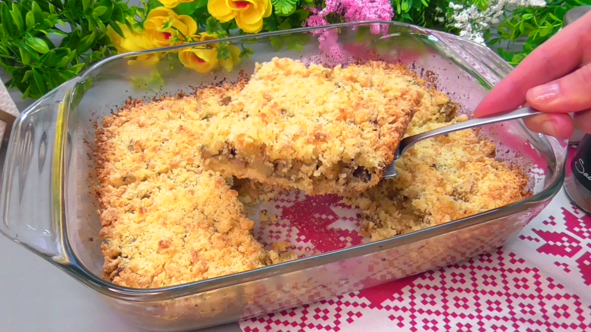 4. Формирование пирога: смажьте форму маслом. Выстелите 2/3 теста, затем распределите начинку и покройте оставшейся крошкой.