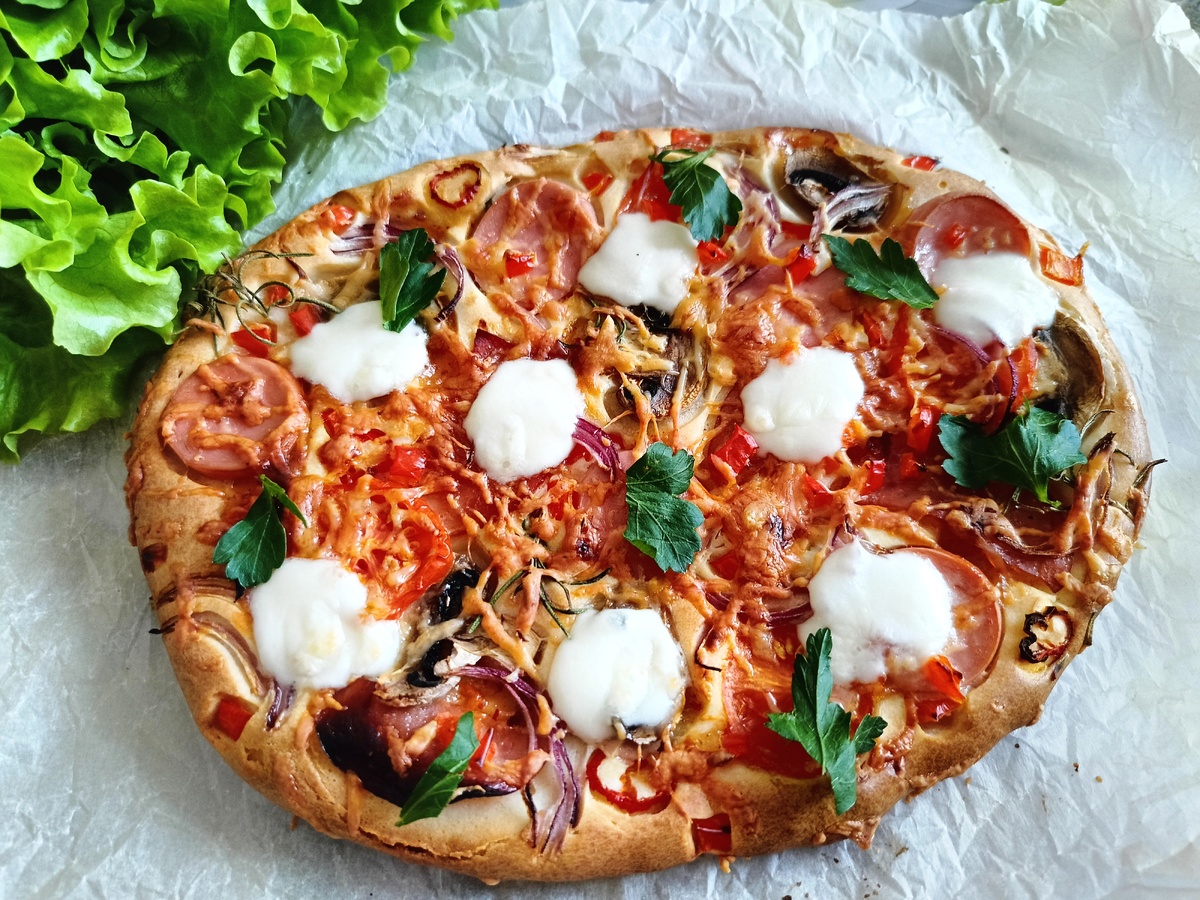 В конце, по желанию, посыпьте готовую пиццу свежей зеленью перед подачей. Приятного аппетита!