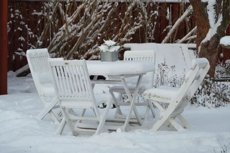 Обслуживание уличной мебели. Важно освободить уличную мебель от накопившегося осеннего мусора и грязи. Если есть возможность, стоит плотно упаковать её на зимнее хранение в гараже или сарае, а оставшуюся мебель укрыть защитными чехлами, чтобы она осталась в хорошем состоянии. Это позволит избежать коррозии и повреждений.