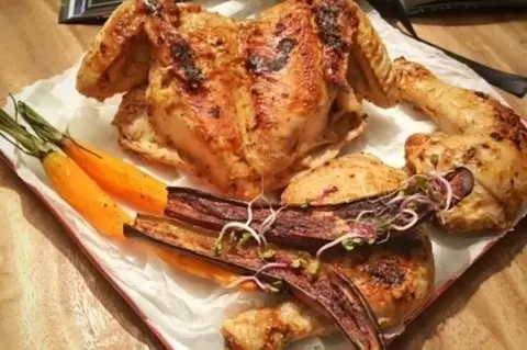 Первым делом тщательно промойте курицу. Удалите лишний жир и хребет, затем приготовьте маринад, смешав йогурт, тимьян, оливковое масло, паприку, уксус, соль и чили. Обильно намажьте курицу маринадом со всех сторон, накройте пленкой и уберите в холодильник на час или более.