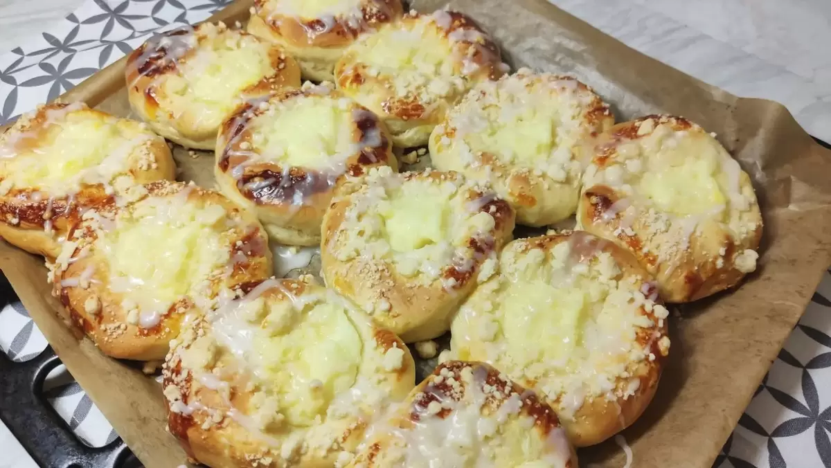 Вас когда-нибудь удивляли новые десерты? Эти ватрушки с поджаренной посыпкой и сахарной глазурью точно привлекут внимание любителей сладкого! Идеально подойдут к вечернему чаю. Указанные ингредиенты рассчитаны на 12 штук вкуснейших ватрушек, а стакан, который используется в рецепте, объемом 250 мл.