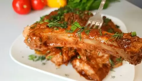 Готовые рёбрышки, которых невозможно устоять, подаются горячими, укрытыми свежей зеленью. Это блюдо идеально сочетает в себе сладость, кислоту и пряность, создавая взрыв вкуса, который долго запоминается. Приятного аппетита!