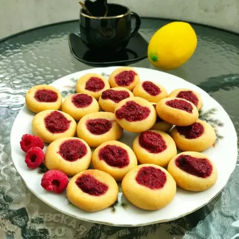 Следующий шаг – заполнение углублений в печеньях джемом, после чего их отправляют в печь, разогретую до 180 градусов, для запекания до золотистой корочки.