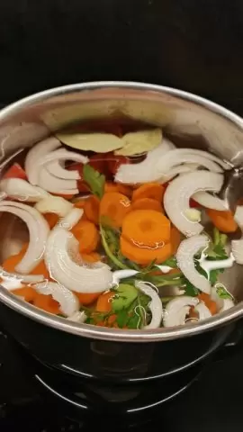 Для начала готовится овощной бульон с лавровым листом, морковью, луком и петрушкой; корень сельдерея в этот раз не попался. Бульон варится на медленном огне около 30-40 минут. Главное – не забывать про перец, который добавляется заранее, а вот соль – в самом конце.