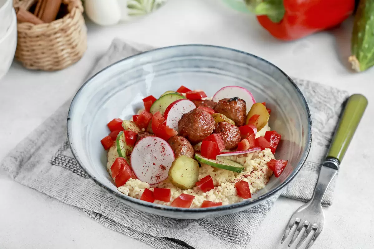 Шаг 4: Подача готова. Выложите хумус на тарелки, сверху разместите фрикадельки, нарезанные овощи и полейте оставшимся оливковым маслом. Специи, такие как паприка, придадут настоящую изюминку вашему блюду. Подавайте сразу, чтобы не потерять свежесть ингредиентов.
