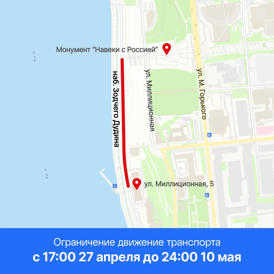 Внимание. В связи с подготовкой к проведению Дня Победы будет прекращено движение автомобильного транспорта: С 17:00 27 апреля до 24:00 10 мая - по набережной Зодчего Дудина на участке от ул. Милиционная, 5 до лестничного...