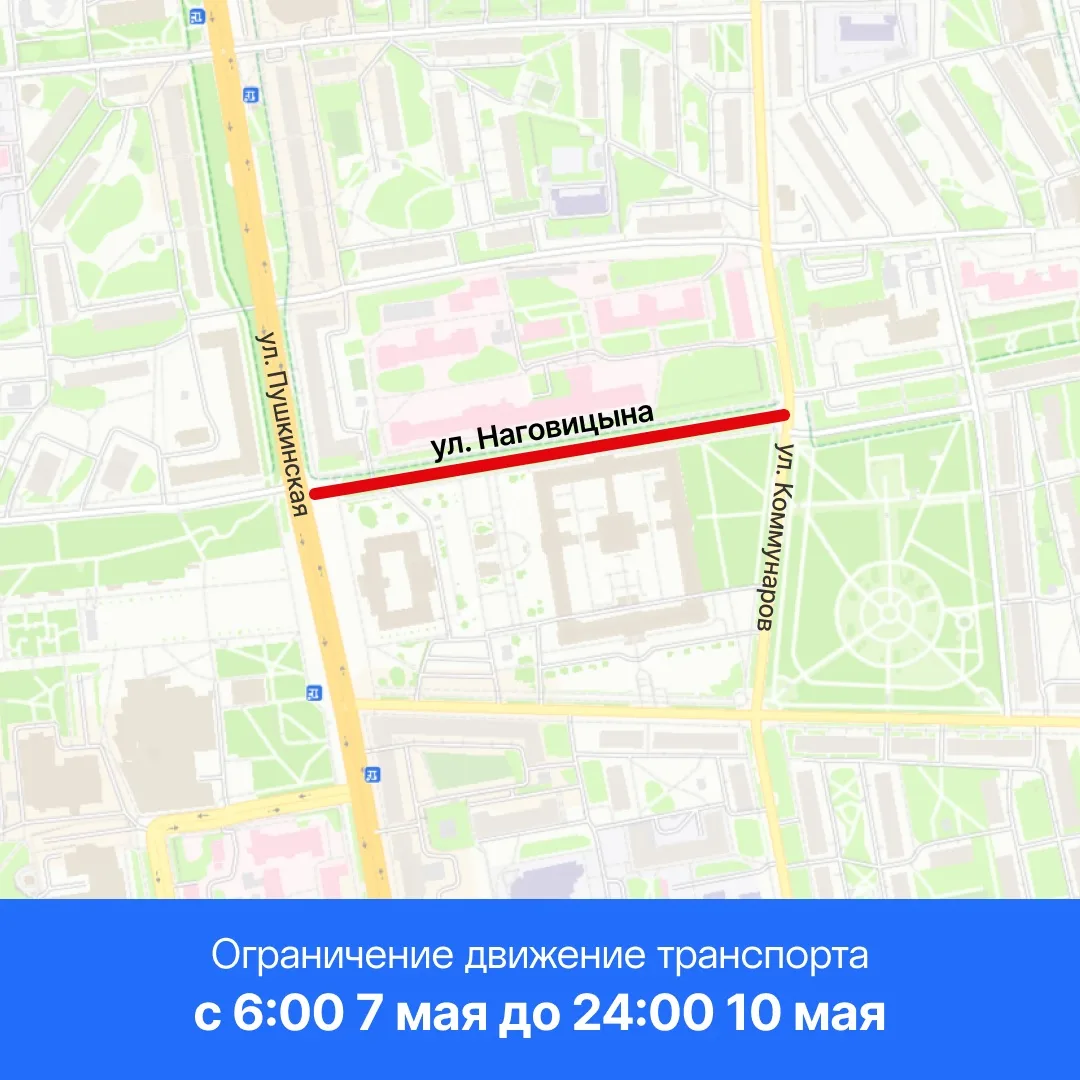 С 6:00 7 мая до 24:00 10 мая - по ул. Наговицына на участке от ул. Пушкинская до ул. Коммунаров