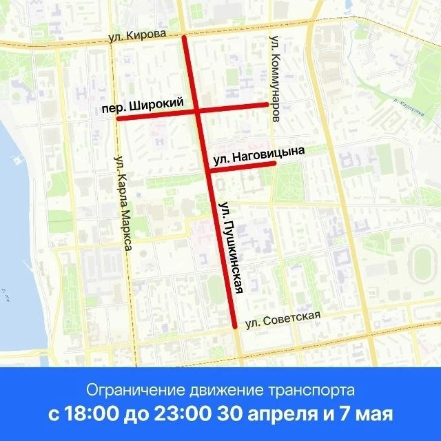 28 апреля и 5 мая с 18:00 до 23:00 – ул. Пушкинская от ул. Красногеройская до пер. Широкий