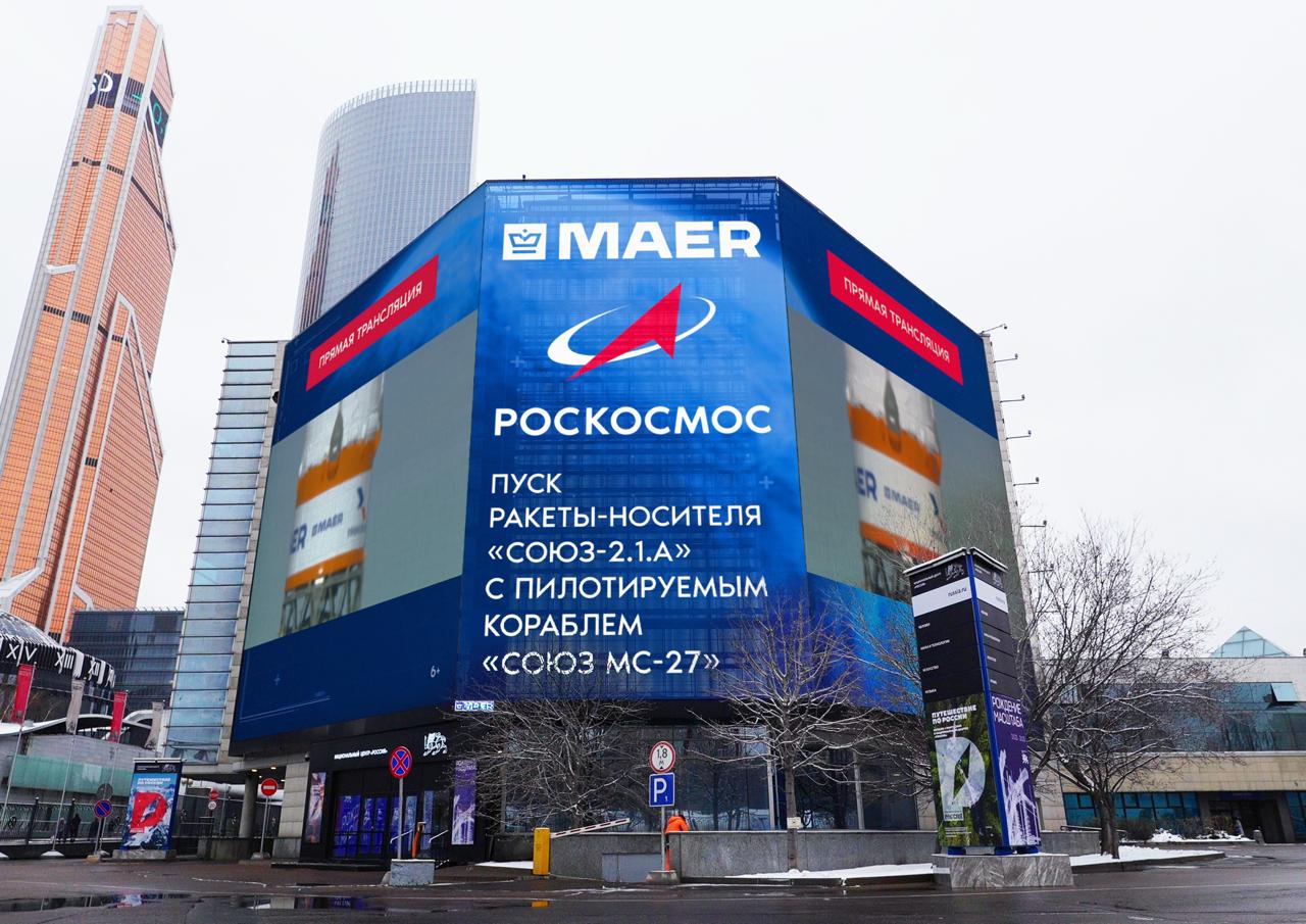 МАЕР провел трансляцию на медиафасадах и цифровых уличных экранах. В прямом эфире миллионы россиян смогли увидеть это событие прямо на улицах своих городов.
